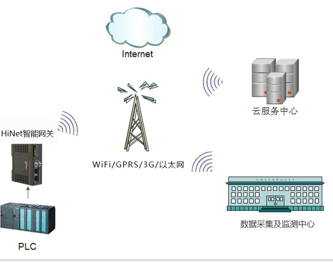 網絡傳輸層由各種網絡,包括互聯網、廣電網、網絡管理系統和云計算平臺等組成,負責傳遞和處理感知層獲取的信息。HINET智能網關能接入SIEMENS、AB、ABB、OMRON、MITSUBISHI等主流PLC,數據加密后遠傳到云端數據服務器中,具有斷點續傳的特點,確保系統的數據完整性。